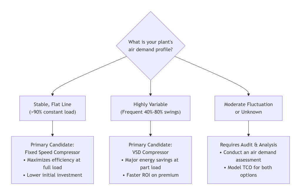 A fixed-speed compressor is a lower-risk option for predictable, high-load scenarios. A VSD compressor is a capital investment in energy efficiency, with the payoff being reduced operating costs for years to come.